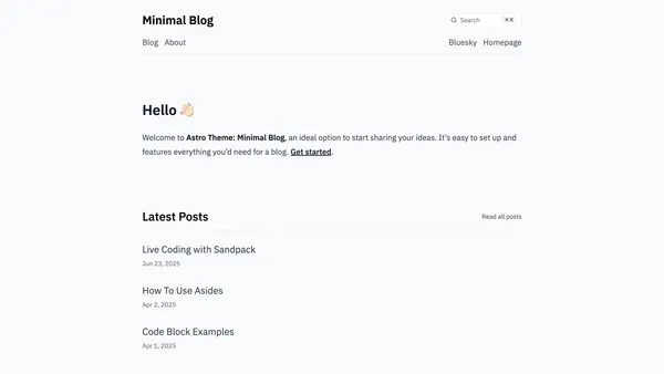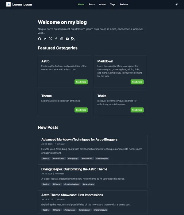 A modern, responsive blog theme for Astro with support for tags, categories, and series. This theme is designed to be fast, SEO-friendly, and easy to customize.