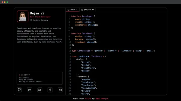 A minimal, easy-to-customize developer portfolio template built with Astro and TailwindCSS. No JavaScript in final build. 100/100 Google PageSpeed Score – for both mobile and desktop. SEO & Social Media Ready, includes OpenGraph, Twitter, and DublinCore metadata.