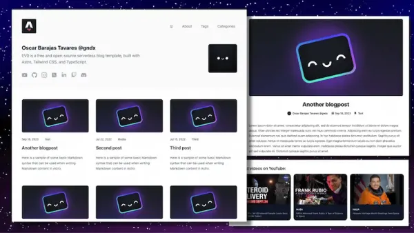 EV0 Astro Theme is a free and open-source serverless blog template, built with Astro, Tailwind CSS, and TypeScript.