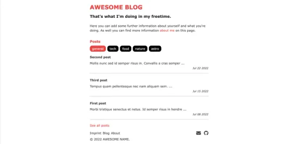 A minimal blog using Tailwind CSS and TypeScript. Integrated tags with filtering for posts by tags, RSS support, auto-generated web manifest and SEO readiness.