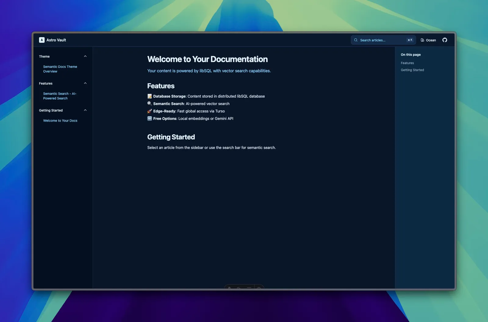 Semantic-docs is a modern documentation theme built with Astro that combines the speed of static site generation with powerful semantic vector search capabilities.
